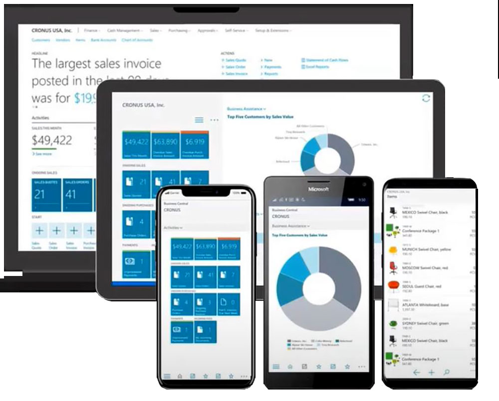 Dynamics 365 Business Central assists small and large companies that have the possibility of increasing efficiency thanks to the automation of processes and integration with MICROSOFT 365 tools (such as Outlook, Excel, Word), Teams for cooperation and sharing among the workmates, Sharepoint for the document collection, Dynamics 365 CRM for Sales, the Advanced Analytics of Power BI, Cortana Intelligence, and Power Automate for the automated workflows.